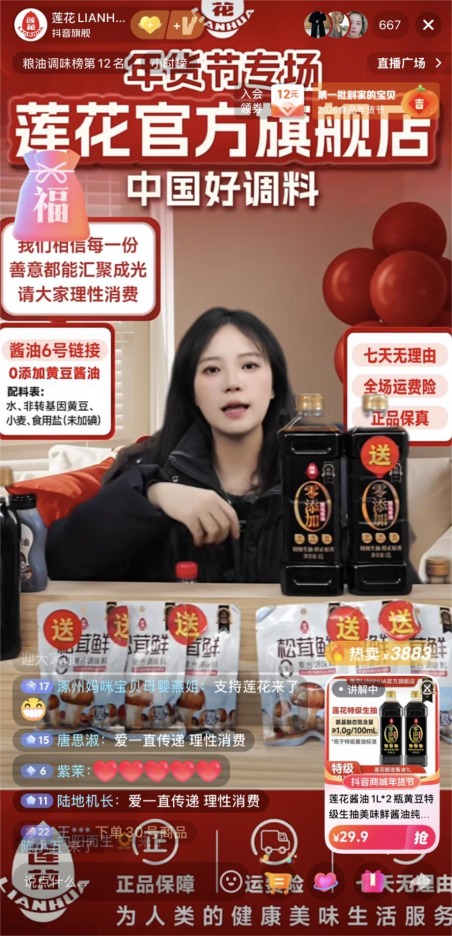 据第三方平台数据,“莲花LIANHUA”抖音官方旗舰店粉丝达158.4万,近一周涨粉量破万,在捐钱信息公布当日,直播间互动量达24.1万,直播带货的多款调味品产物销量也在近期呈现增长态势。