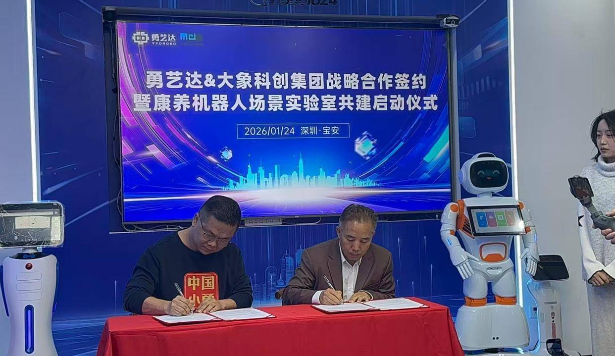 1月24日,深圳勇艺达机器东谈主有限公司与大象科创数字经济产业(深圳)集团有限公司隆重签署计谋合作框架公约,两边将共同组建“康养机器东谈主场景实验室”,起劲于处明智谋养老范围的时代落地贫寒。