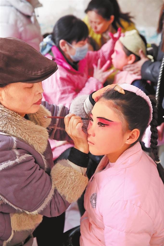 参预庙会的小演员们在化装。