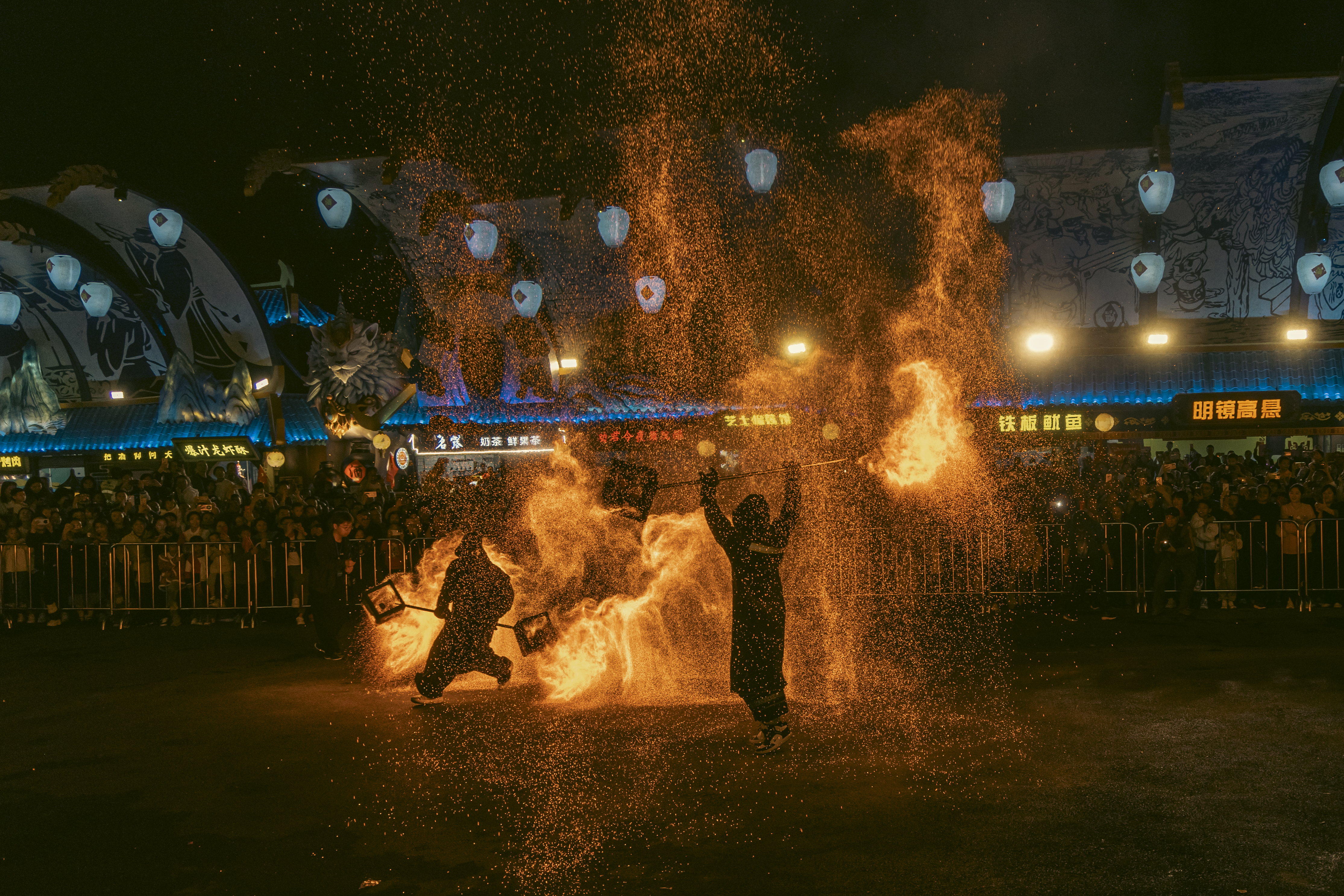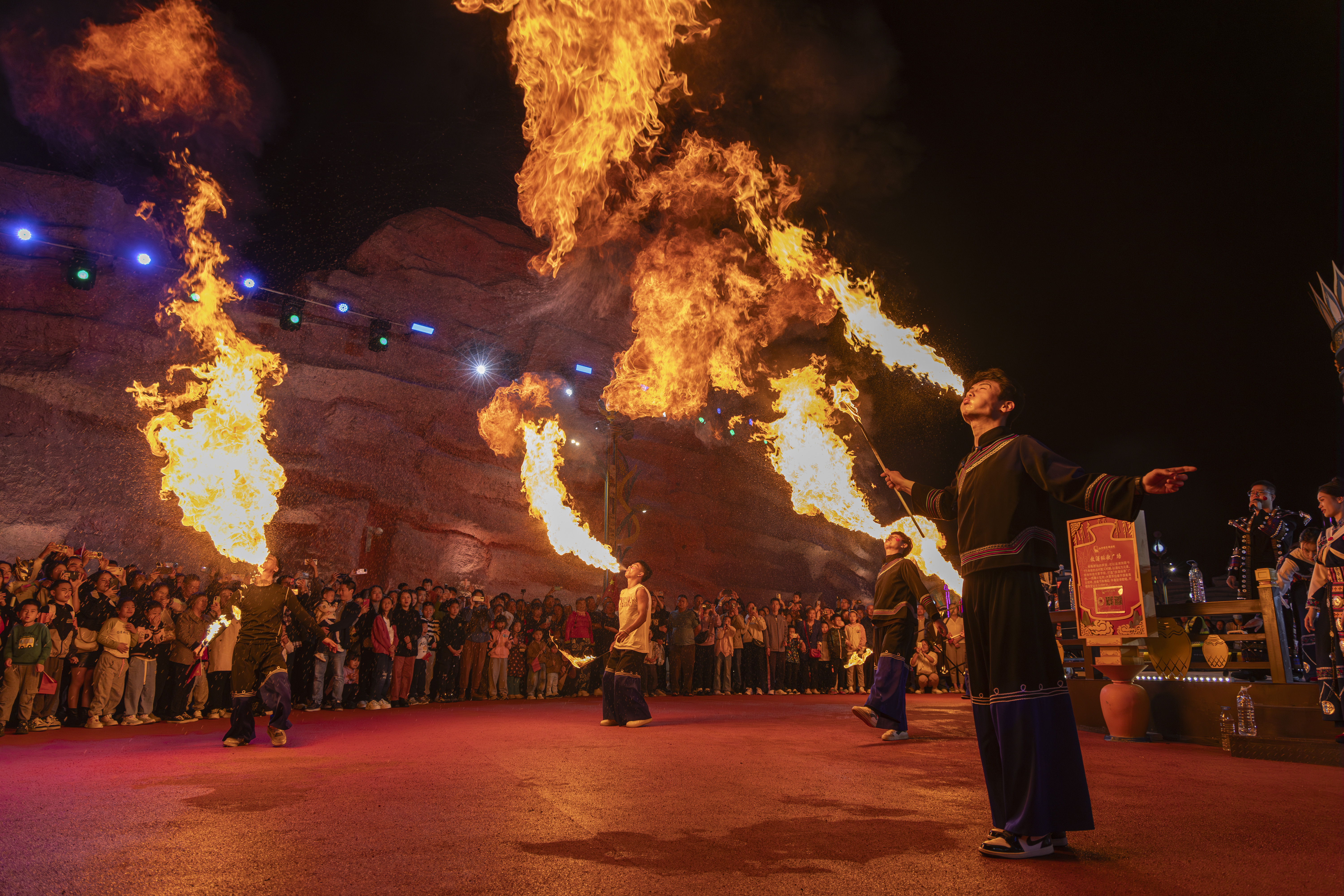 春节时代,江山明月·醉酒城的喷火扮演。