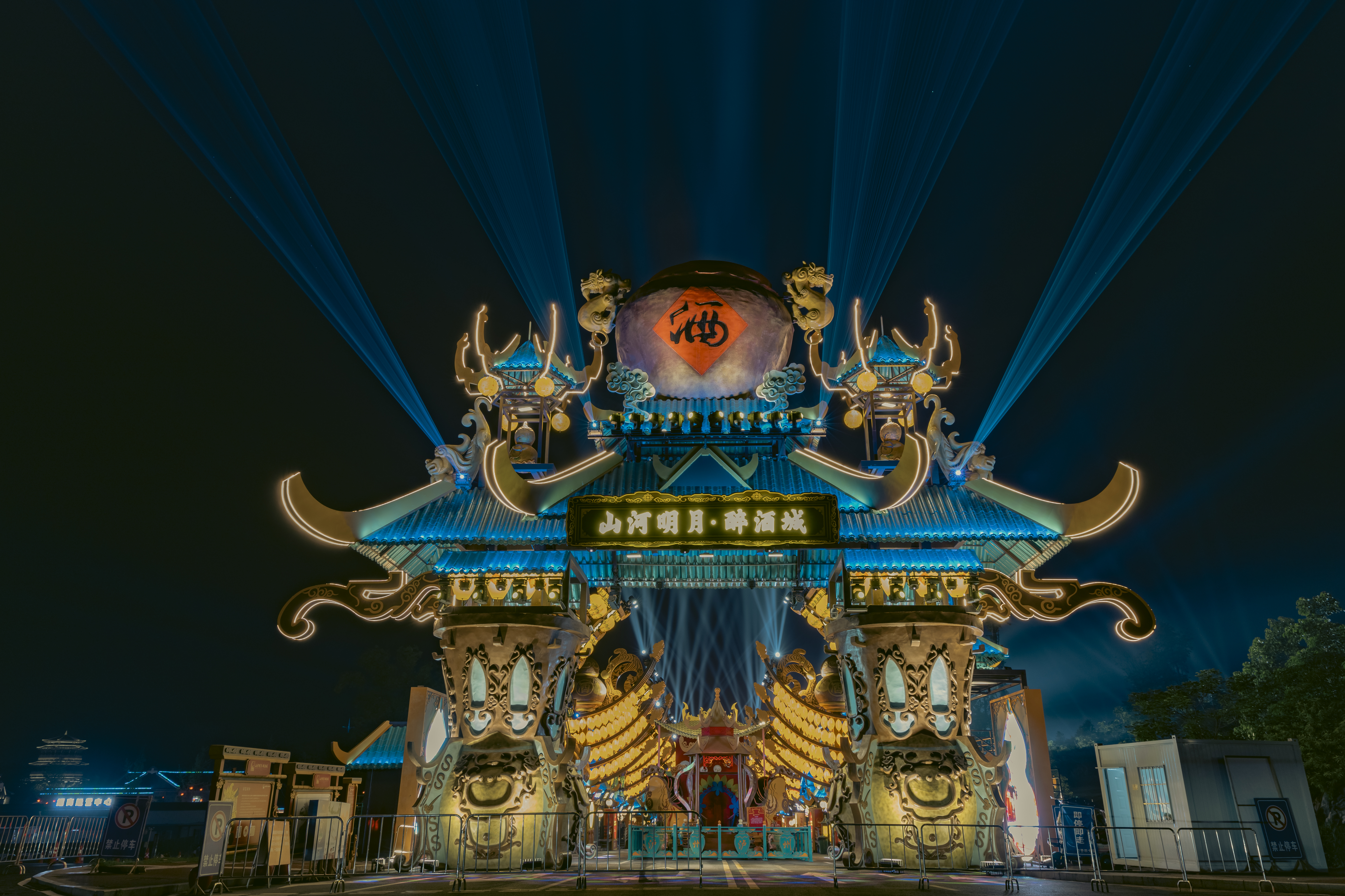 长达600米的街区,酒器造型的考取建筑门楼迎万客来不雅。将视野放在街区的中线看,巨兽打卡安装与景象演绎联接总计街区,贵妃醉酒、好意思东说念主鱼扮演、篝火扮演等26个主题艺术扮演点位和多少个打卡安装,构成了江山明月·醉酒城的基地,成为总计街区的超等亮点。