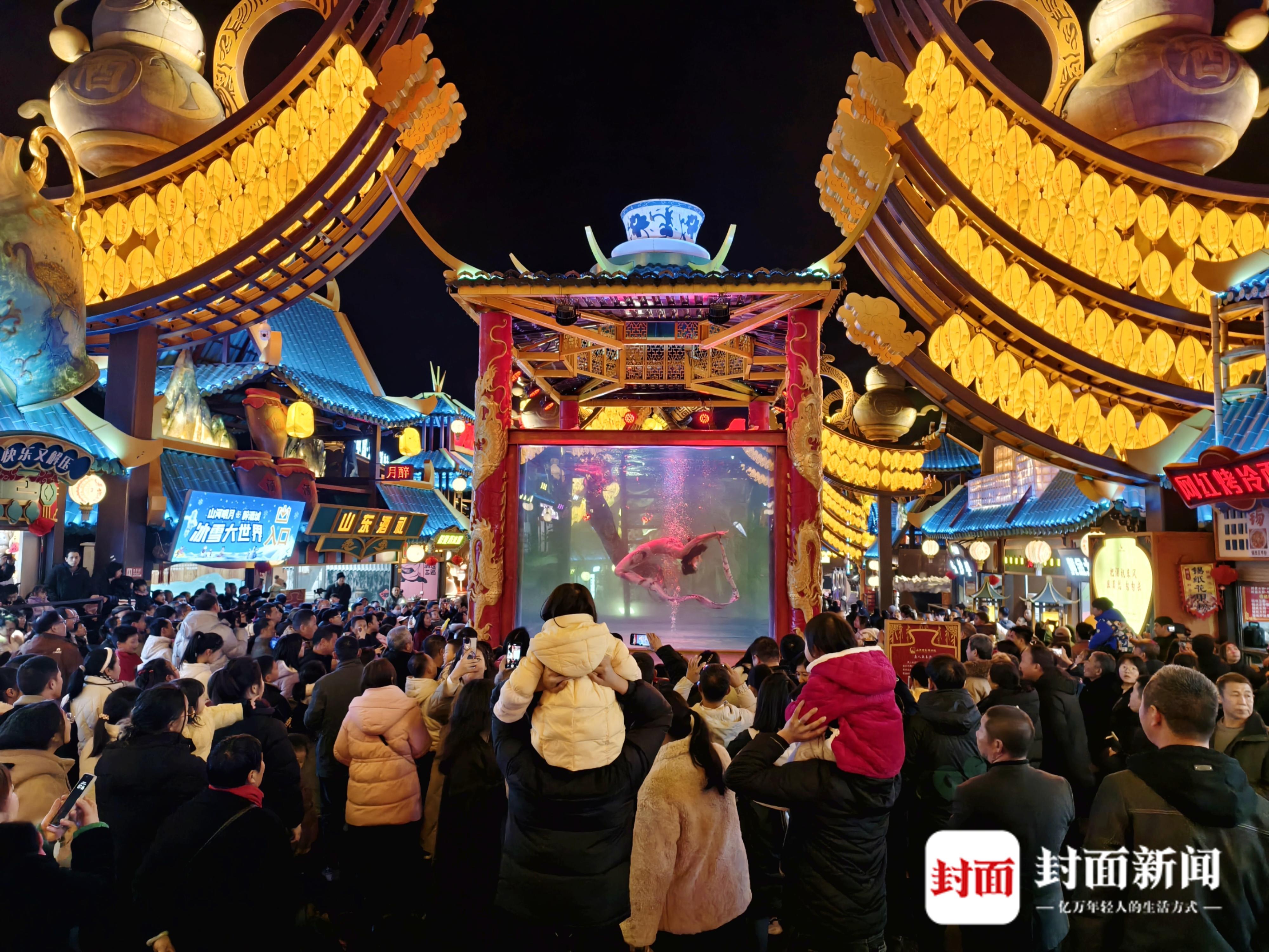 2月7日晚,旅客在江山明月·醉酒城不雅看好意思东说念主鱼扮演。(徐庆影相)