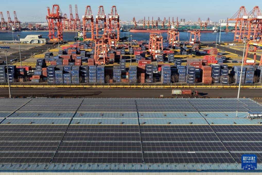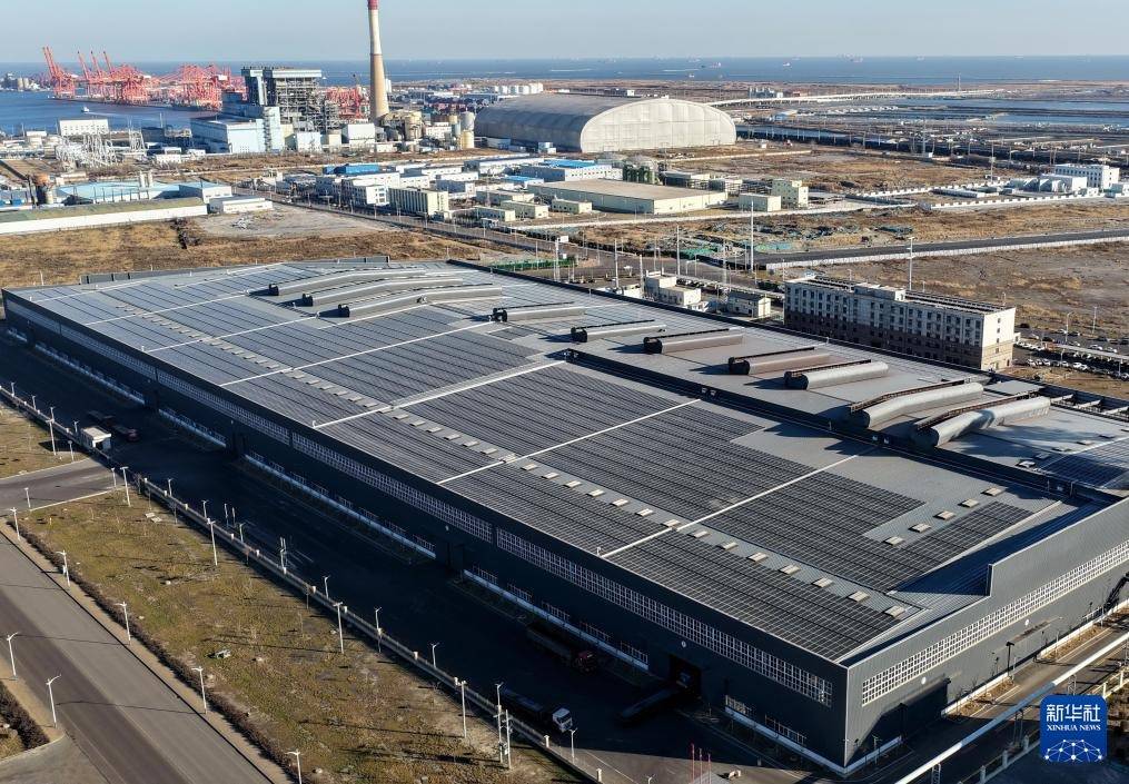 这是12月25日拍摄的唐山市海港经济开拓区一家企业厂房屋顶上的光伏发电池(无东谈主机像片)。